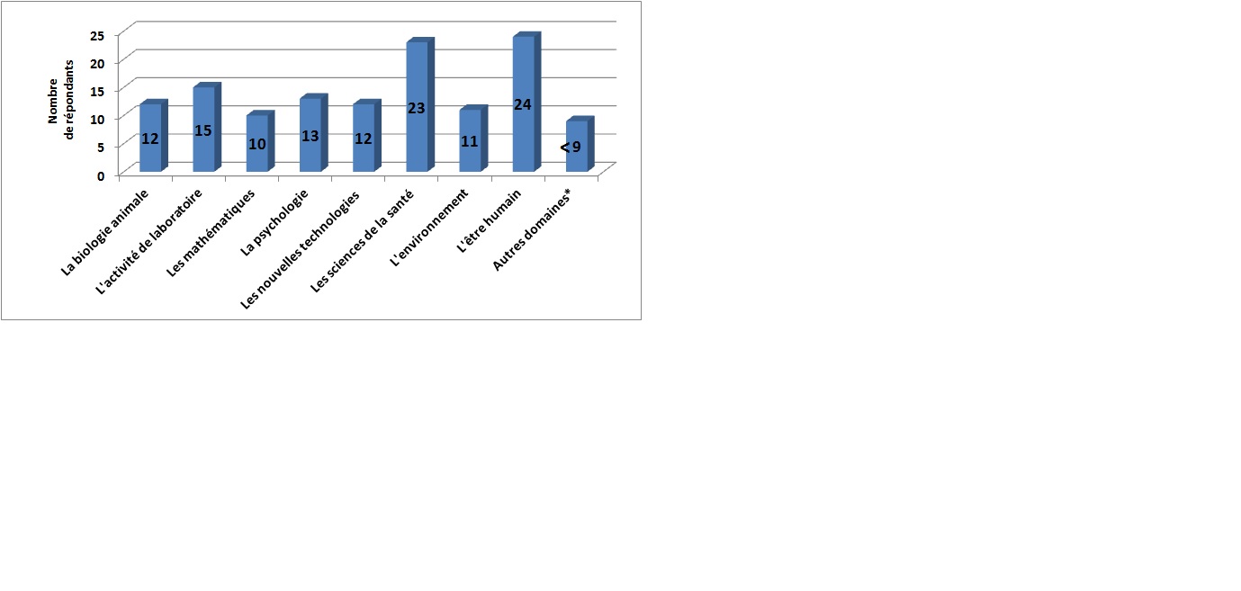 Fig. 1. L’histogramme montre le nombre d’élèves en fonction du domaine d’intérêt (*astronomie, électricité et électronique, ingénierie, biochimie, bioélectricité, biologie végétale, biomécanique, chimie moléculaire, chimie organique, chimie-physique, géométrie, mécanique, modélisation, physique, programmation informatique, sciences des matériaux, sciences de la terre, sciences statistiques).